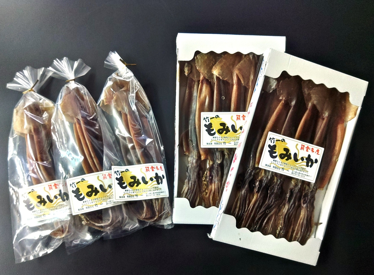 竹一自家製のもみいか(袋入り、写真左)です。
